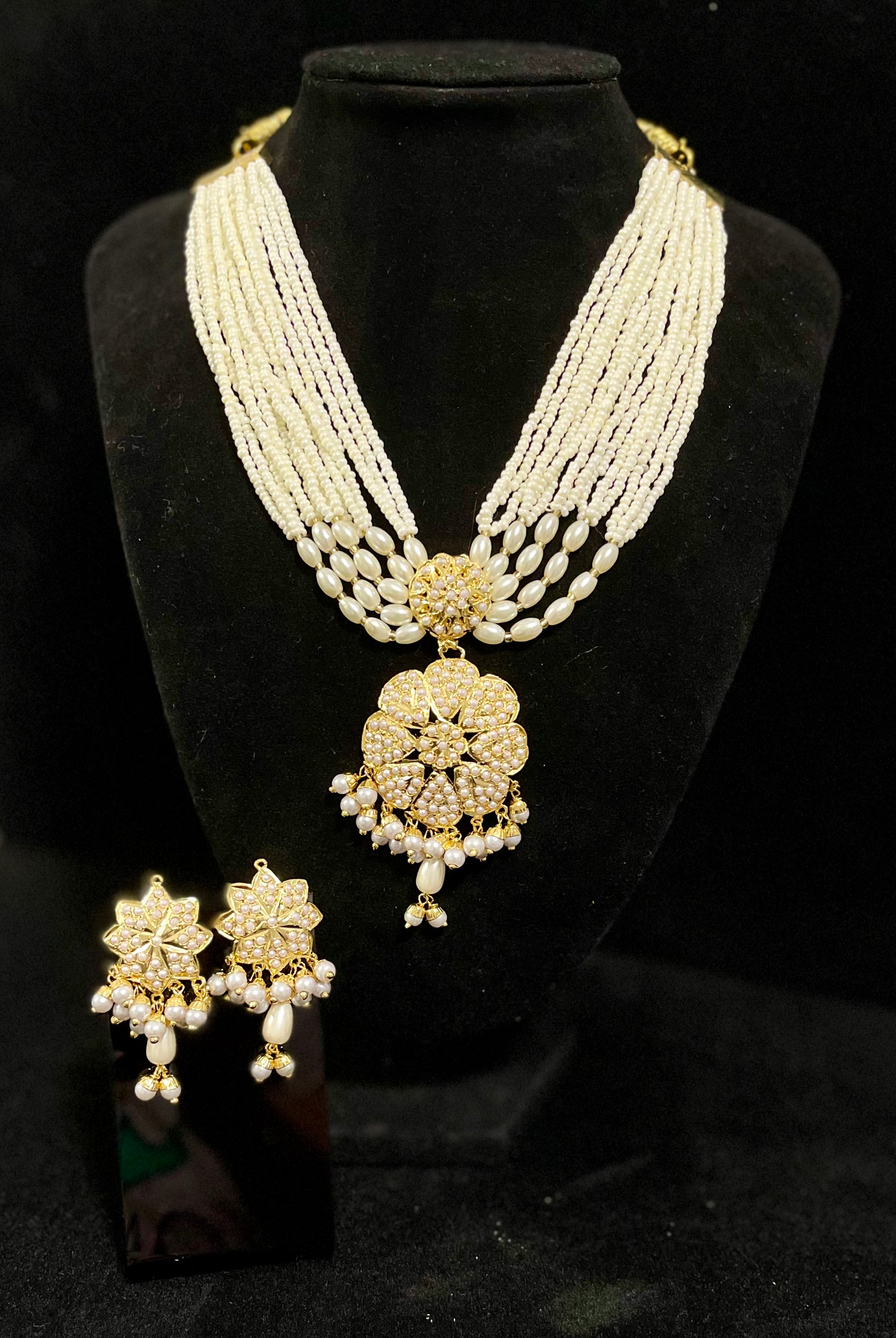 A gold plated handmade traditional Jadau Set. It had faux pearls with detailed work done by expert craftsmen.