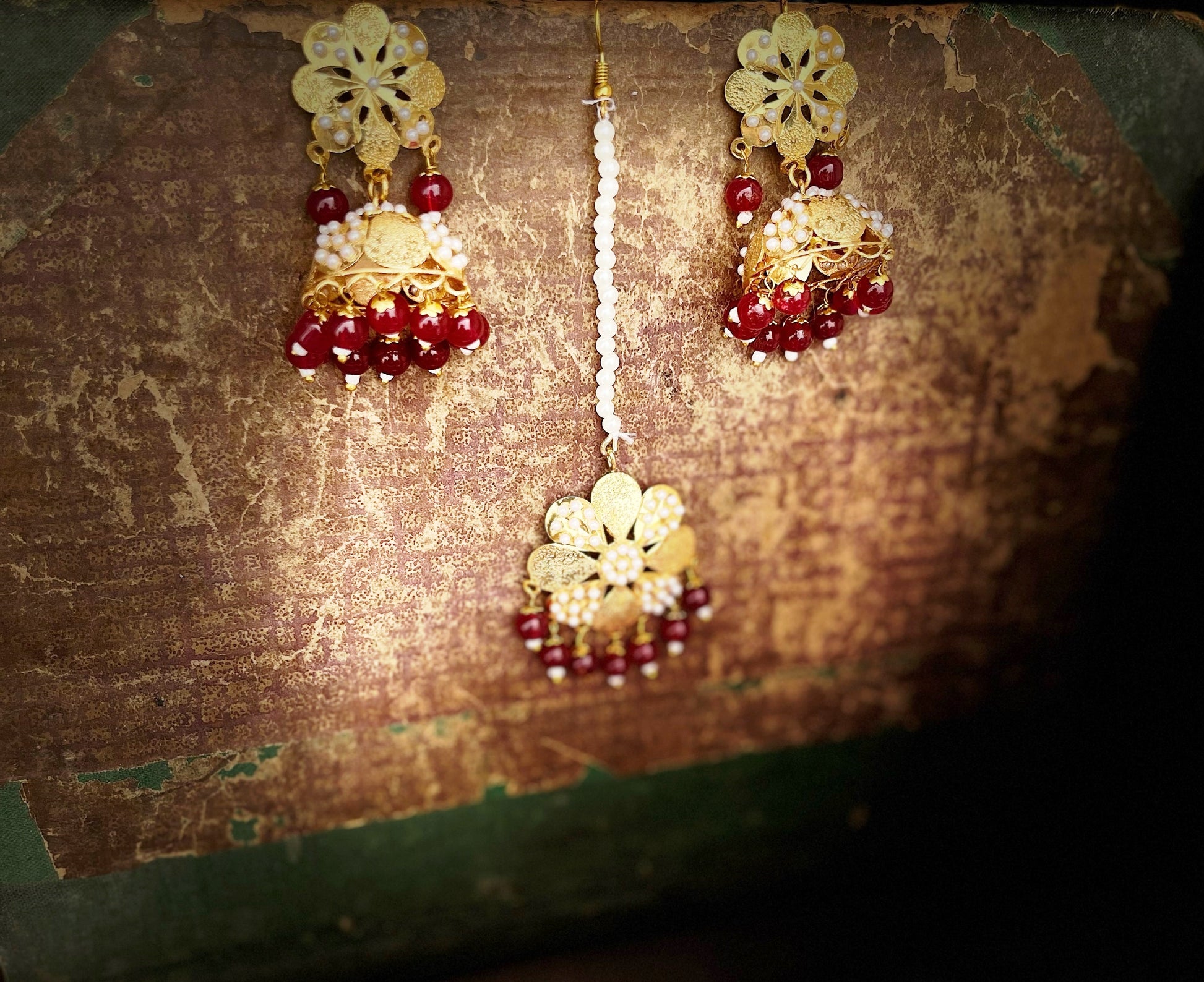 The Pretty Jadau Maang Tikka with Jhumkis - Maroon