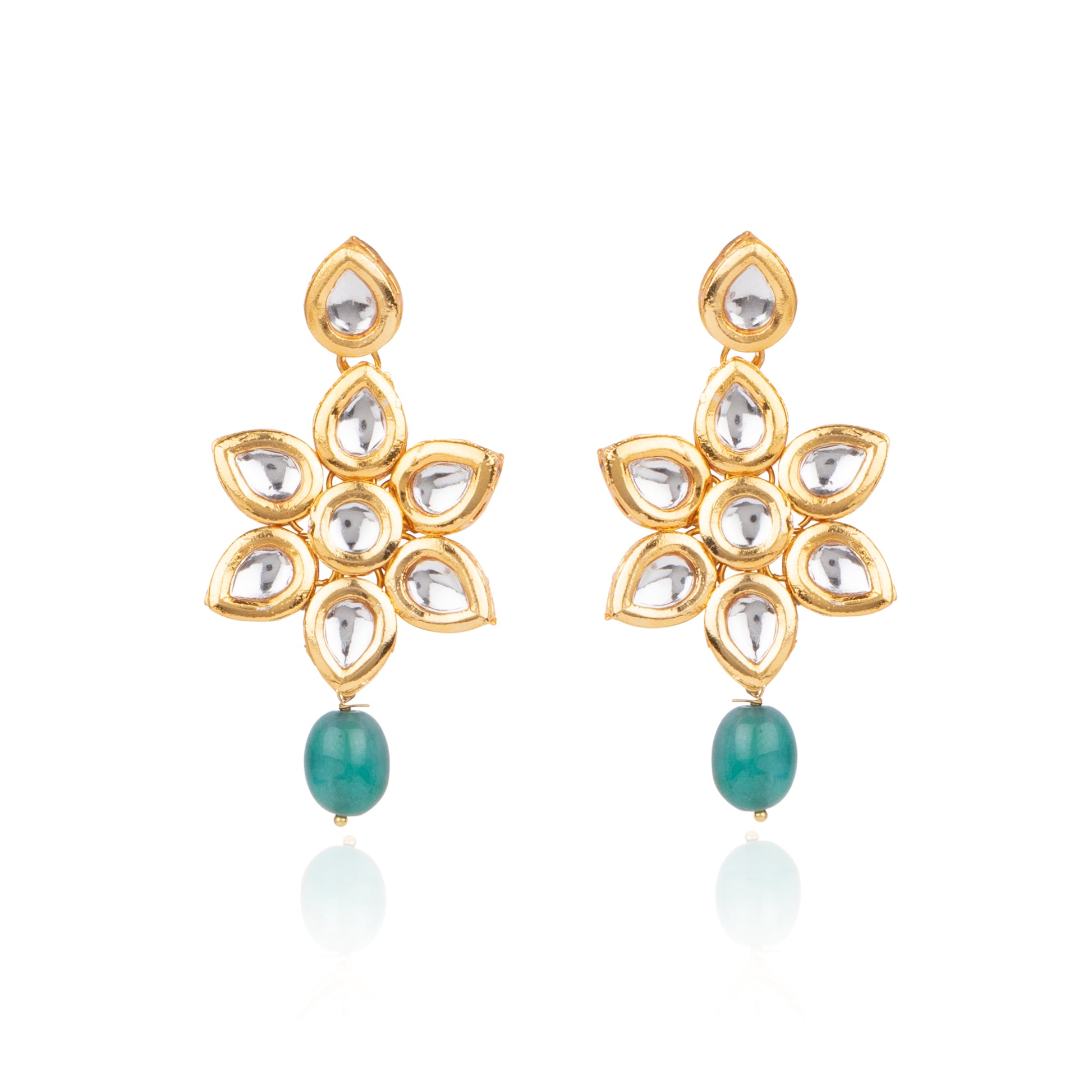 A Kundan studded necklace with matching earring that have green pearl drops.