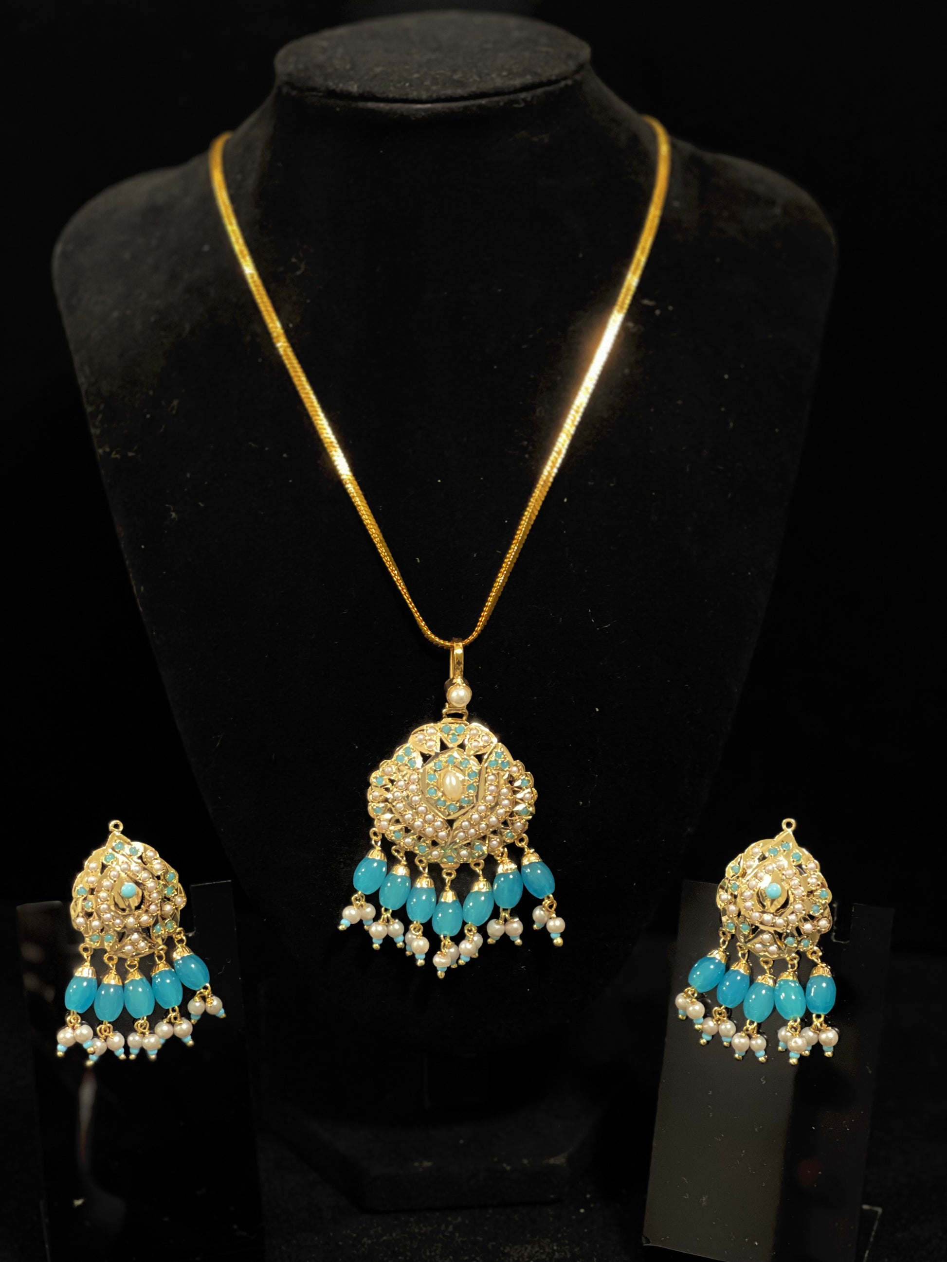 A Turquoise Luxury Pendant Set, that comes with chain. It is gold plated and crafted with traditional Jadau work by expert craftsmen.